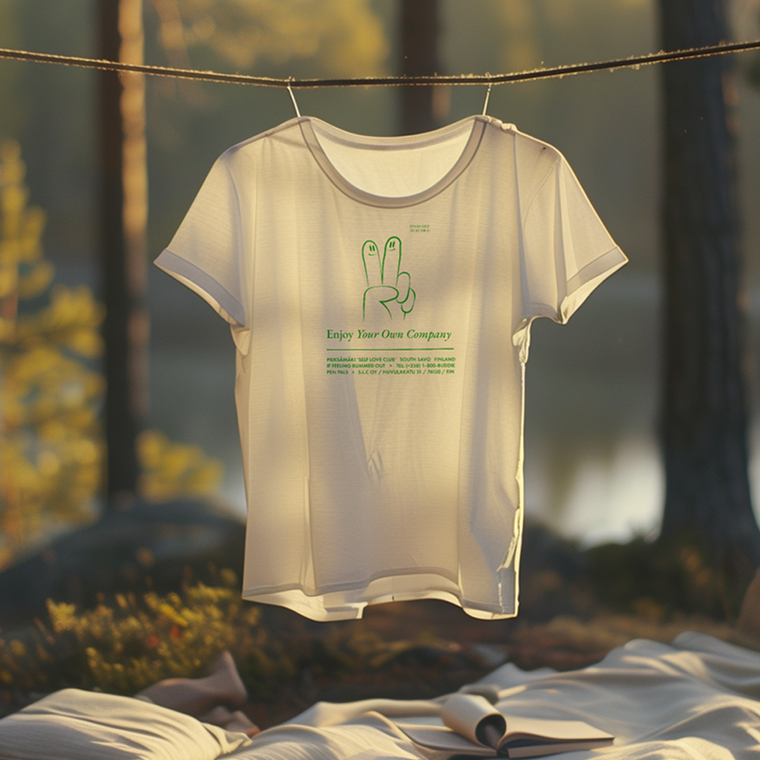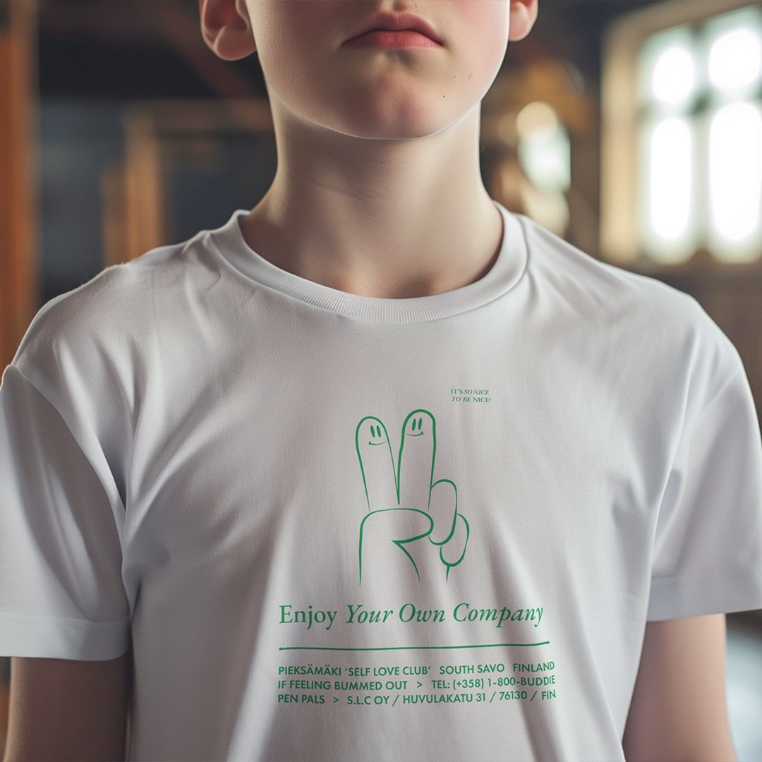Embrace the art of self-love with the "Enjoy Your Own Company" shirt from the Pieksämäki Self Love Club. Perfect for those moments when you need a reminder that it’s nice to be nice—to yourself! Featuring a playful illustration, this shirt encourages you to find joy in your own company and cherish your inner peace.