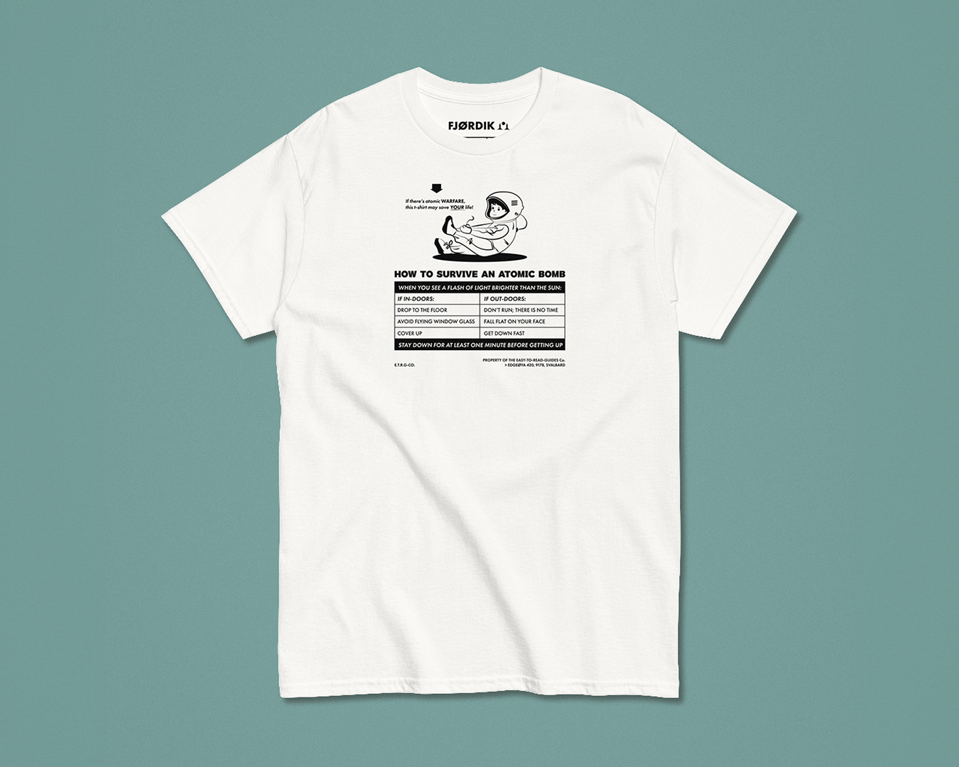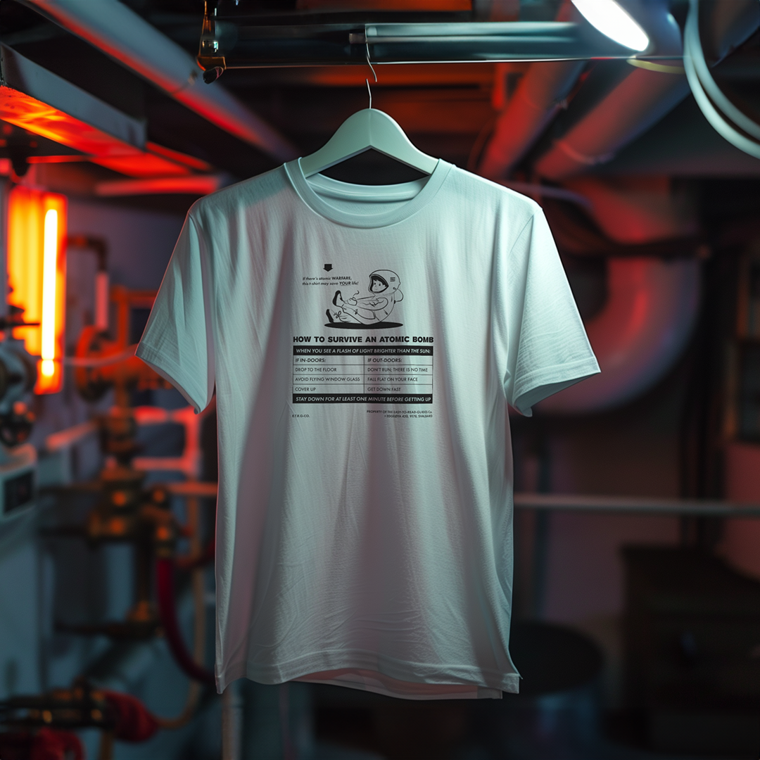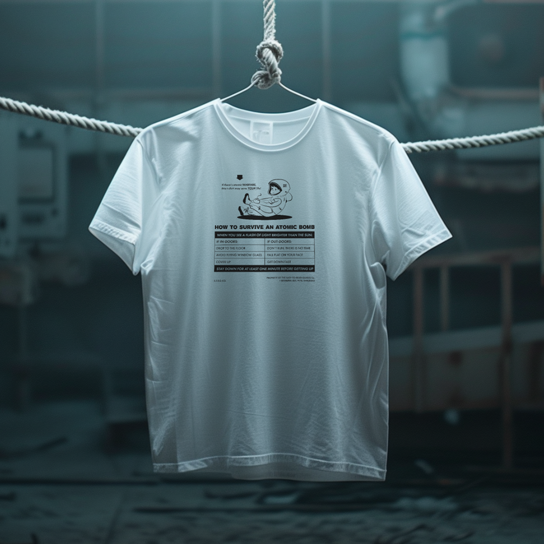 Introducing the "How to Survive an Atomic Bomb" shirt—a nostalgic yet practical guide straight from the archives! Featuring timeless tips for both indoor and outdoor scenarios, this shirt adds a quirky touch of retro preparedness to your wardrobe. Perfect for those who appreciate a blend of history and humor, it’s a must-have for any collector of unique memorabilia.