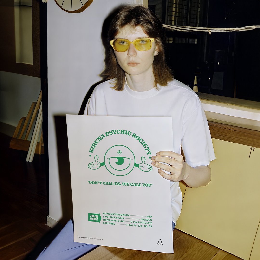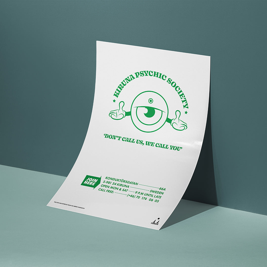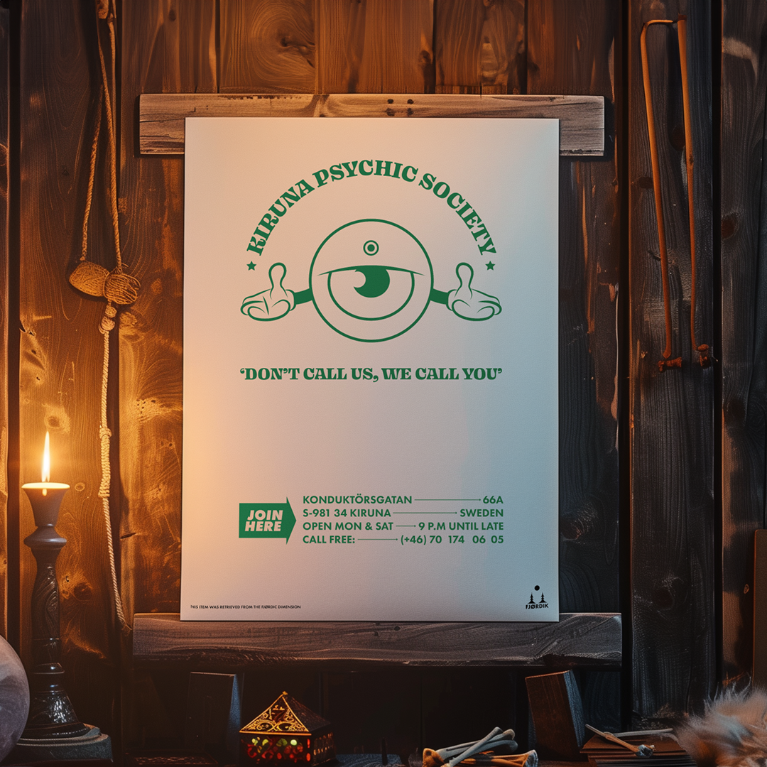 Unlock the mysteries of the universe with the "Kiruna Psychic Society" poster! Established in 1983, this society is renowned for its unique approach: "Don't call us, we call you." Whether you’re seeking answers or just curious, let our expert psychics reach out and enlighten you when the time is right. Join the society that knows you’re coming before you do!