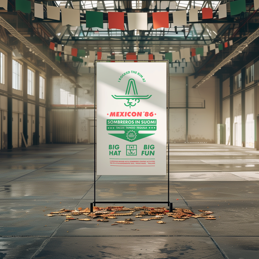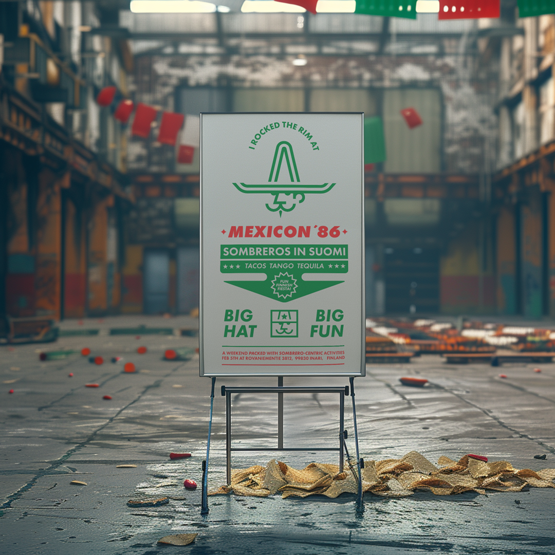 Step into the wild and untamed fiesta of "Mexicon '86 - Sombreros in Suomi"! This legendary event brought tacos, tango, and tequila to Finland, mixing chaos and culture in one unforgettable night. With big hats and even bigger fun, this poster captures the raw, gritty essence of a party that was anything but tame.