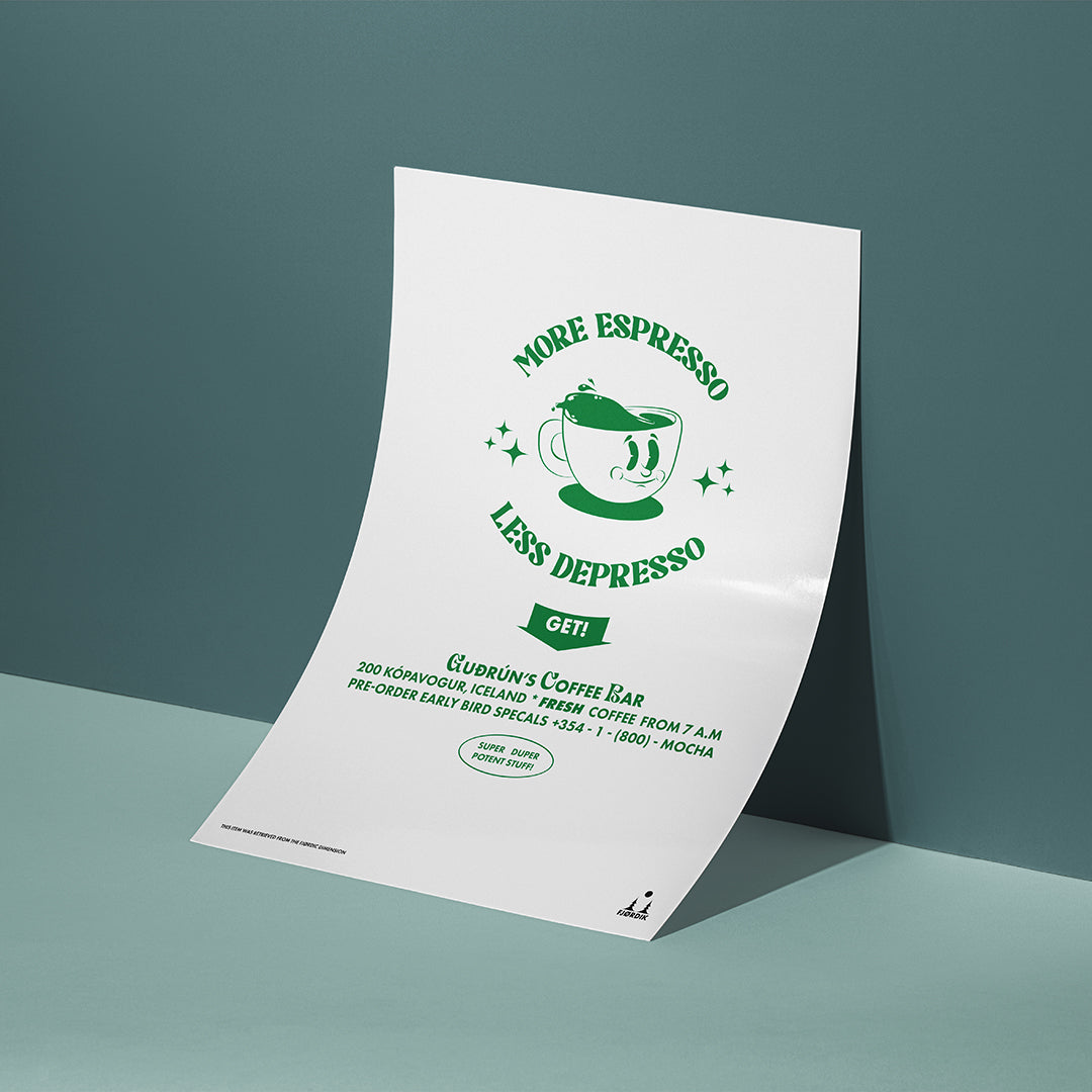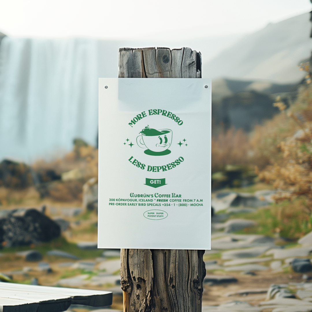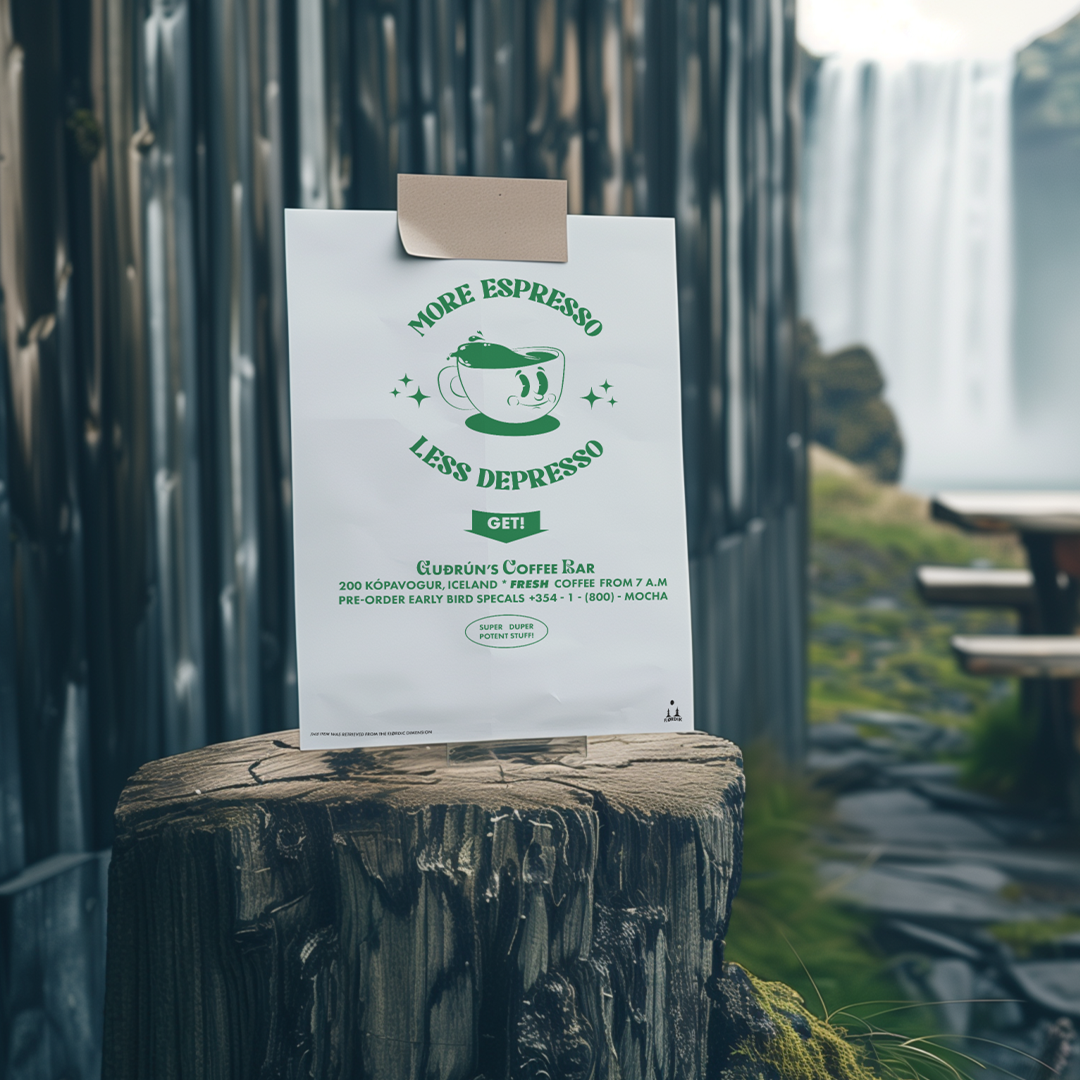 Experience the potent power of Gudrún's Coffee Bar with the "More Espresso, Less Depresso" poster. Her robust brews are guaranteed to kickstart any shitty day and chase away the blues. Ideal for those who need an extra jolt to power through life's rugged grind, this poster is a testament to the undeniable energy boost of quality espresso.