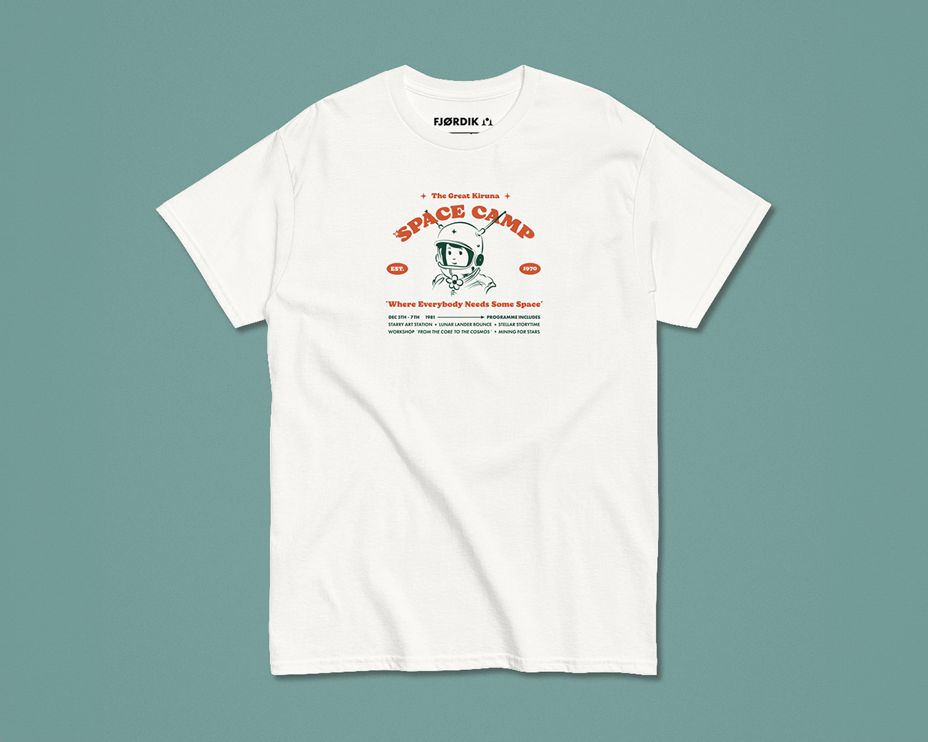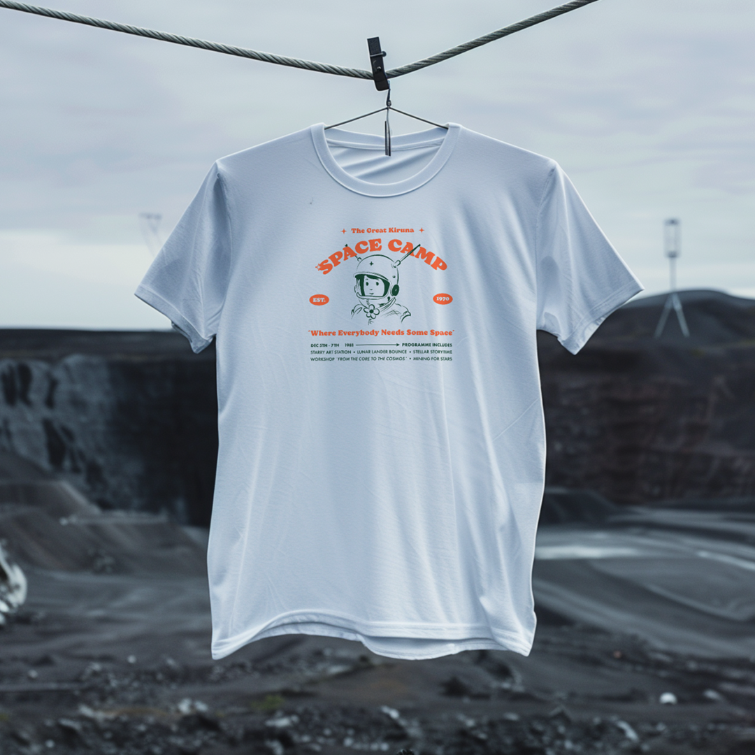 Blast off to adventure with the "The Great Kiruna Space Camp" shirt! Established in 1970, this camp is where everybody truly needs some space. From lunar lander bounces to stellar storytime, join us for a program that takes you from the core to the cosmos. Perfect for aspiring astronauts and cosmic dreamers alike!